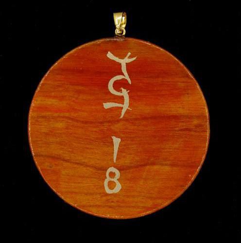 Der Durchmesser des Anhängers beträgt ca. 44 mm, die Stärke ca. 5 mm. Für die Bemalung auf Kirschbaumholz wurden nach der Lasur-Grundierung mit Stärke gebundene Pigmentfarben verwendet. Ein Kunstharz-Klarlack schützt den Anhänger vor Witterungseinflüssen.