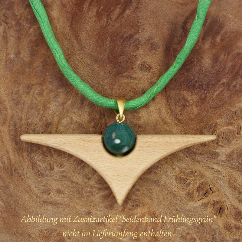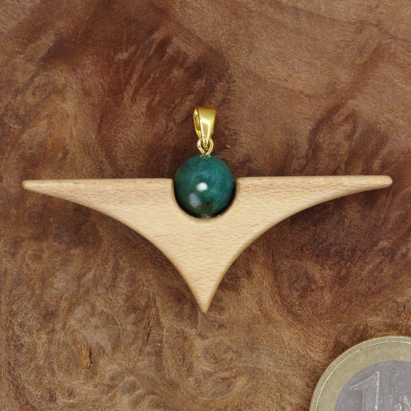 Kettenanhänger in sehr elegantem Design aus Ahornholz. In der Mitte liegt eingebettet eine Steinperle aus Chrysokoll.