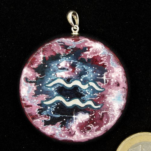 Amulett bemalt mit dem astrologischen Symbol Wassermann auf blau-violettem Sternenhimmel.