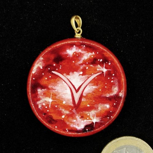 Amulett bemalt mit dem astrologischen Symbol Widder auf rotem Sternenhimmel.
