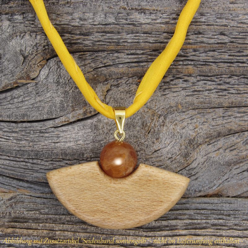 Fächerförmiger Kettenanhänger aus Ahornholz mit Sonnenstein-Perle. Kettenschlaufe 925er silber vergoldet.