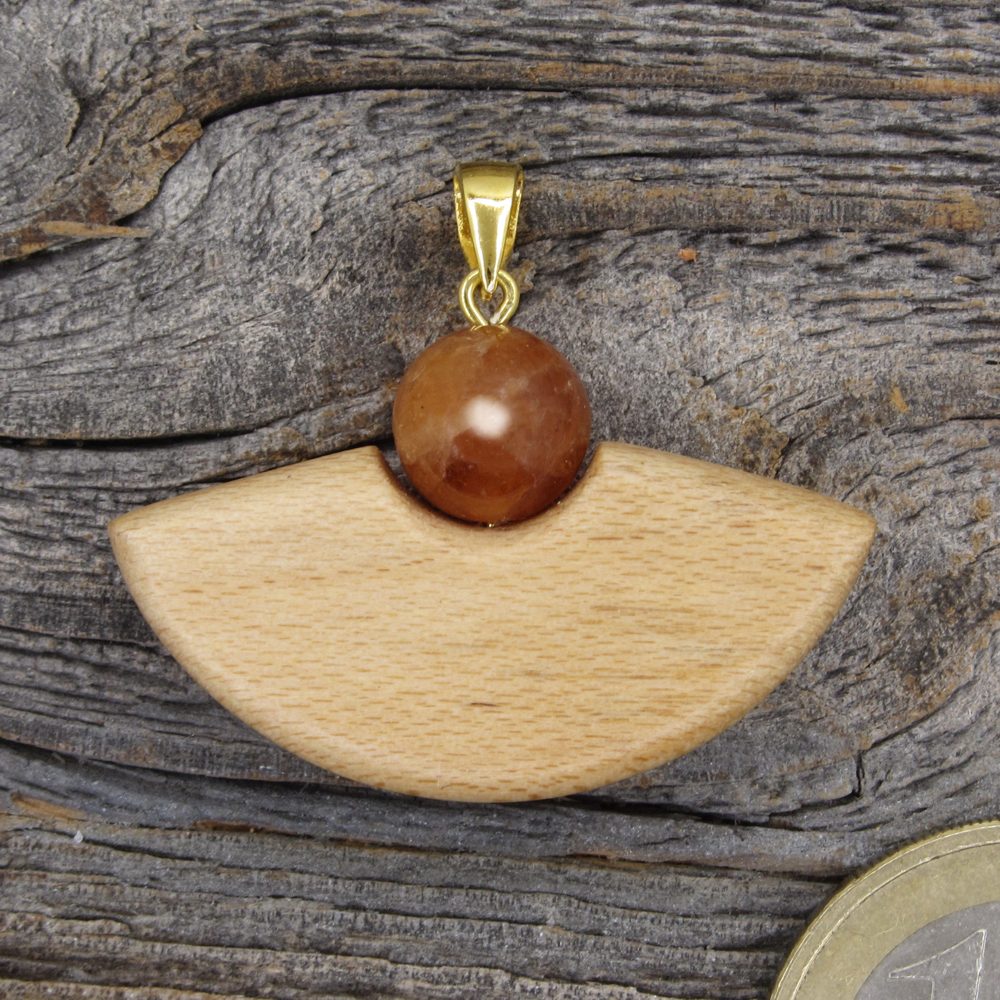 Kettenanhänger aus Ahornholz. Im Zentrum des Kreises liegt eingebettet eine Steinperle aus Sonnenstein. Das fächerförmige Design ist angelehnt an die Zeit des Art Deco der 1920er Jahre und ist doch zeitlos elegant.