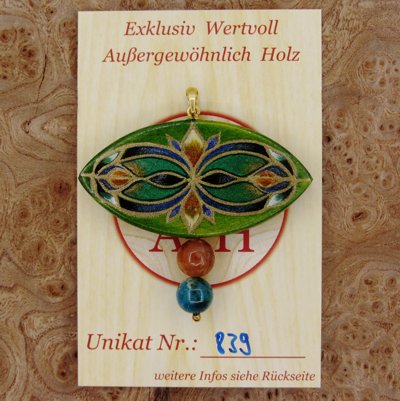 Kettenanhänger aus Fichtenholz; bemalt mit einer typischen Ornamentik aus der Kunstepoche des Jugendstiles in der Übergangszeit vom 19. zum 20. Jahrhundert. Am Unteren Rand sind mittig 2 Edelsteinperlen angebracht, deren Durchmesser 8mm beträgt: Die obere Perle ist ein Sonnenstein und für diejenige darunter haben wir einen Chrysokoll als zusätzlichen farblichen Kontrast ausgewählt. Die Steine sind drehbar und werden von einem Kugelstift im Holz gehalten.