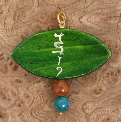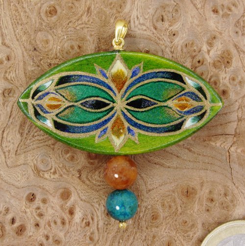Kettenanhänger bemalt mit einer Ornamentik aus der Jugendstil-Zeit und je einer Sonnenstein- und einer Chrysokoll-Perle auf der Unterseite.