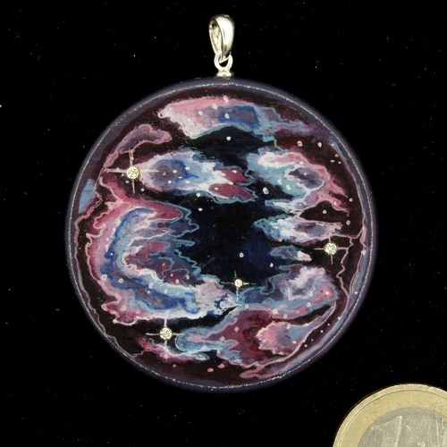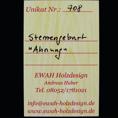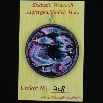 Der Durchmesser des Anhängers beträgt ca. 45 mm, die Stärke ca. 5 mm. Für die Bemalung auf Kirschbaumholz wurden nach der Lasur-Grundierung mit Stärke gebundene Pigmentfarben verwendet. Ein Kunstharz-Klarlack schützt den Anhänger vor Witterungseinflüssen. Der Anhänger ist mit 4 Kristallglassteinen besetzt.
