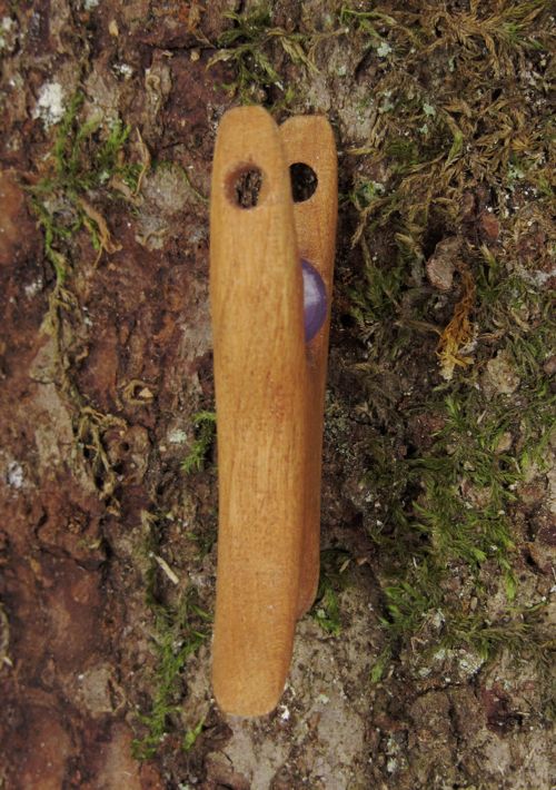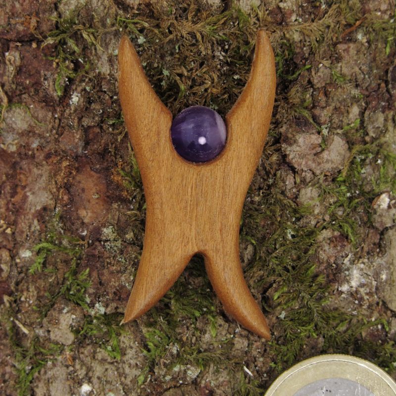 Die Länge des Anhängers beträgt ca. 40 mm, Breite ca. 22 mm, Stärke insg. ca. 6 mm, Steindurchmesser ca. 8 mm. An den Flügeln befindet sich je eine Bohrung von Ø 2,5 mm zum Durchziehen für Ketten oder Bänder. Die Amethyst-Perle ist mit einem Nylondraht im Holz befestigt – somit kann der Anhänger auch für metallfreien Schmuck verwendet werden.