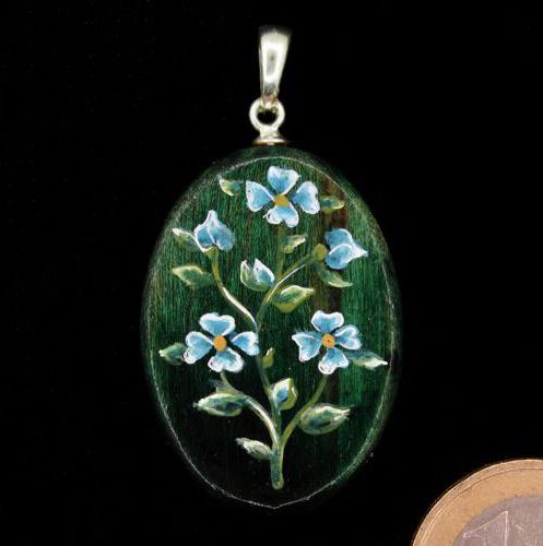 Ovaler grüner Trachtenanhänger mit Vergißmeinnicht bemalt.