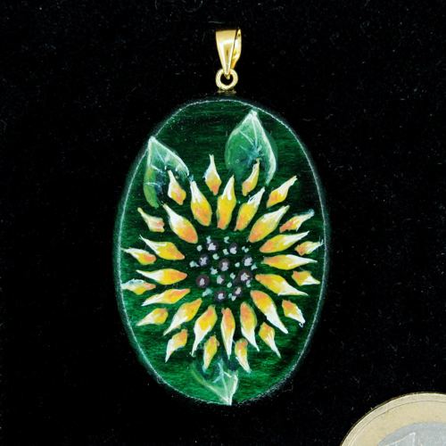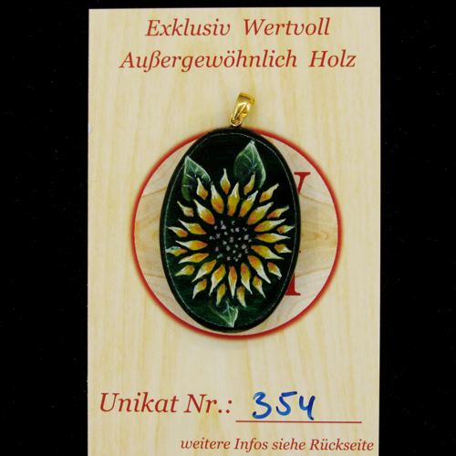 Die Länge des Anhängers beträgt ca. 37 mm, die Breite beträgt ca. 26 mm, die Stärke ca. 5 mm. Für die Bemalung auf Kirschbaumholz wurden nach der Lasur-Grundierung mit Stärke gebundene Pigmentfarben verwendet. Ein Kunstharz-Klarlack schützt den Anhänger vor Witterungseinflüssen.